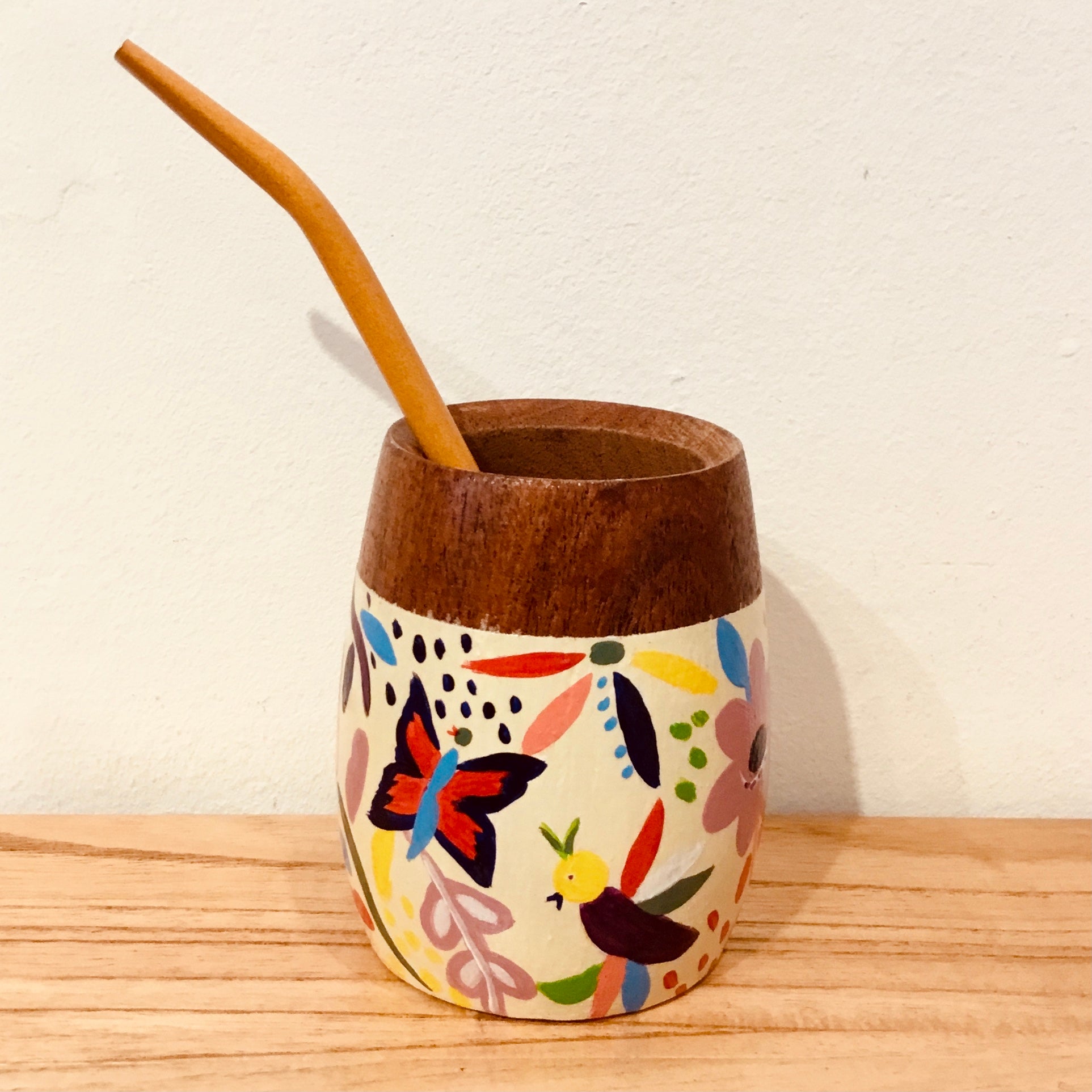 Mates de madera de algarrobo con diseños mexicanos, pintados a mano con pincel.