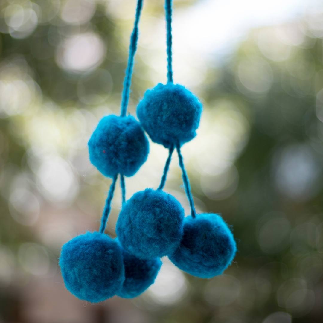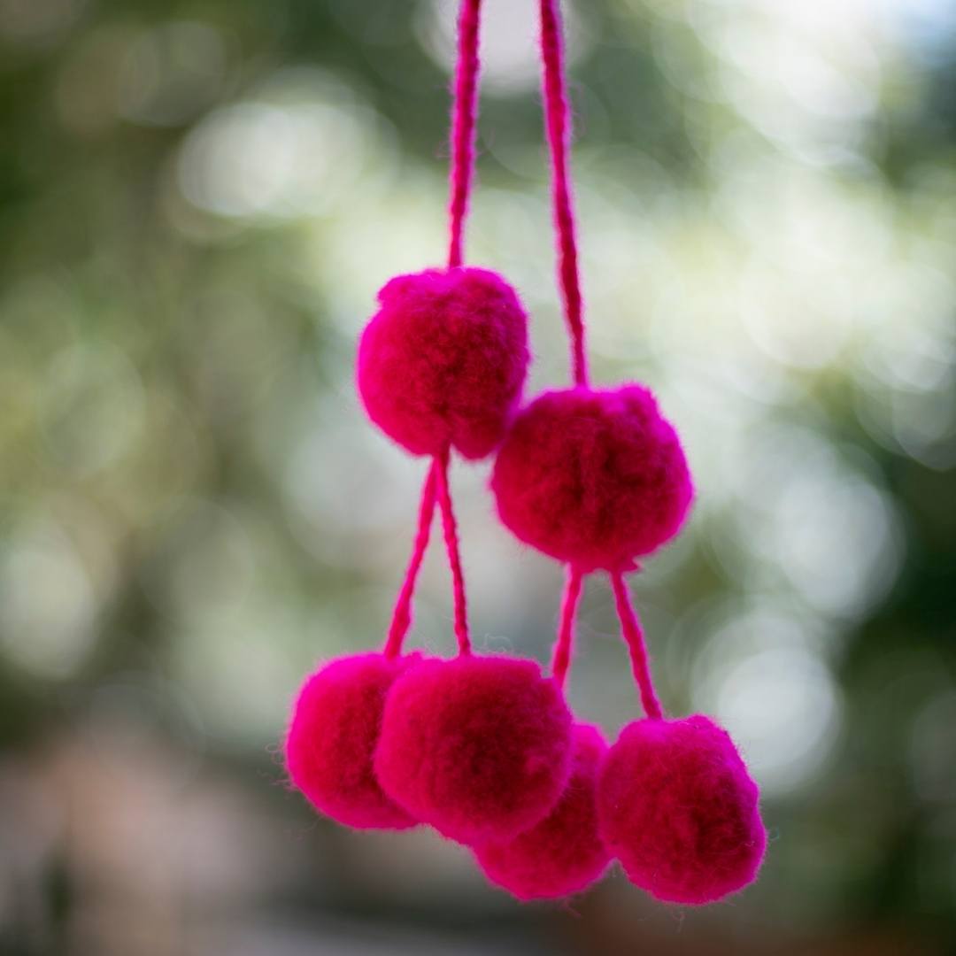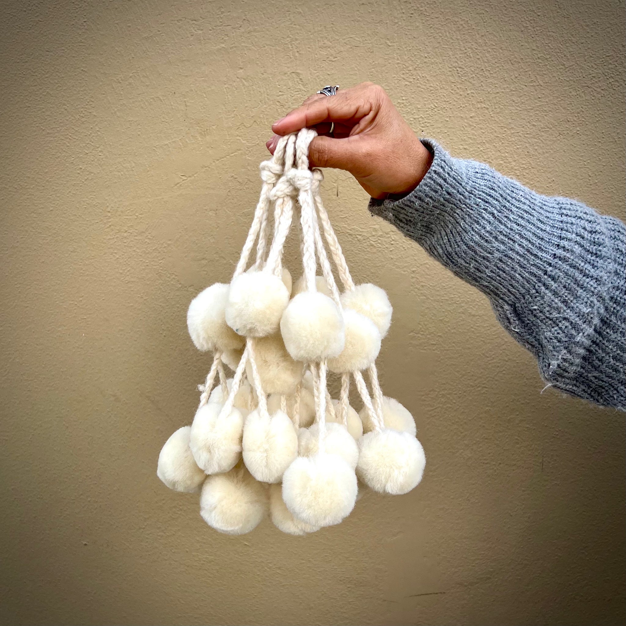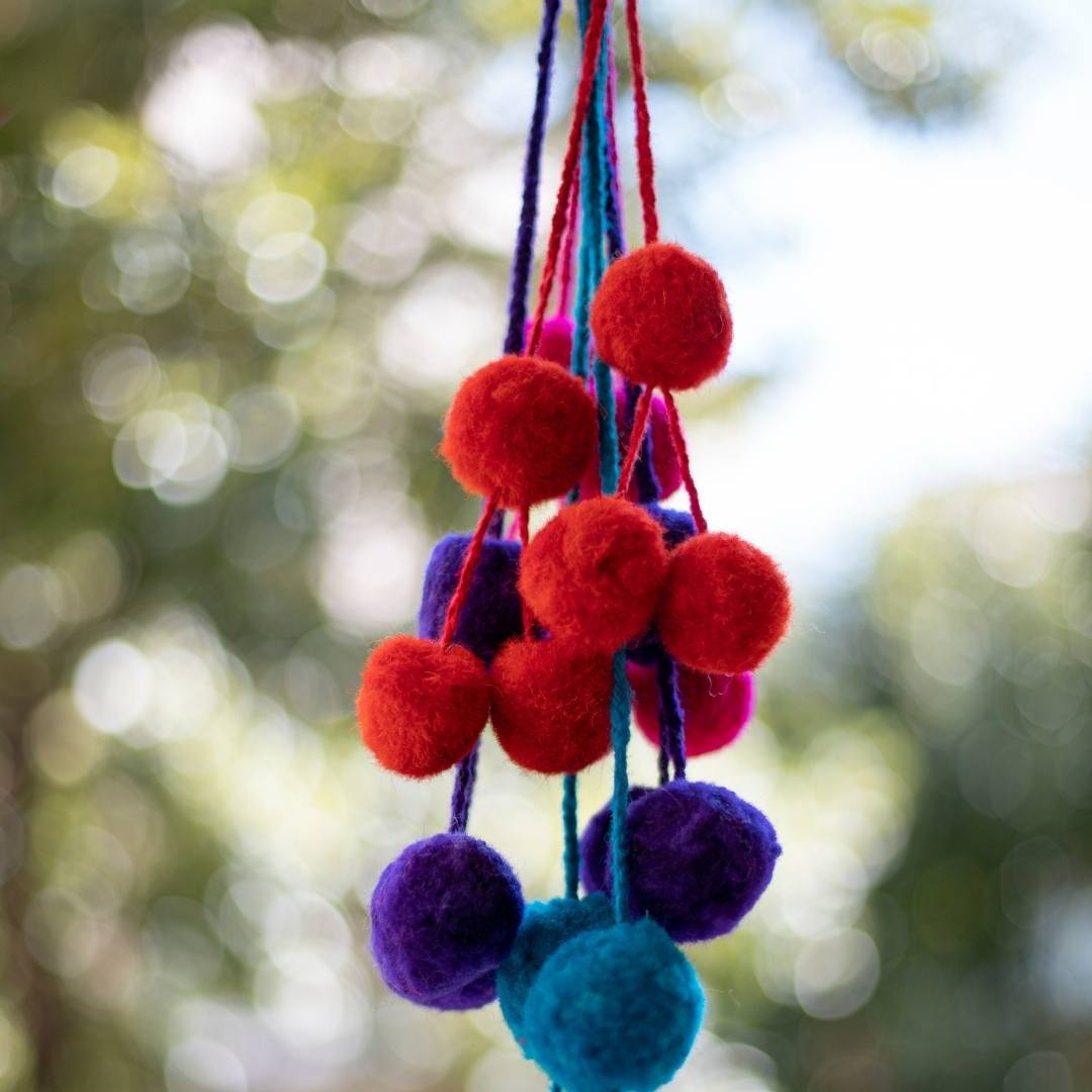 Tiras decorativas con tres pompones en cada extremo. Realizadas en pura lana teñida naturalmente por las artesanas que las elaboran. Ideales para decorar los picaportes o cajoneras de tu casa y/o sujetar cortinas.