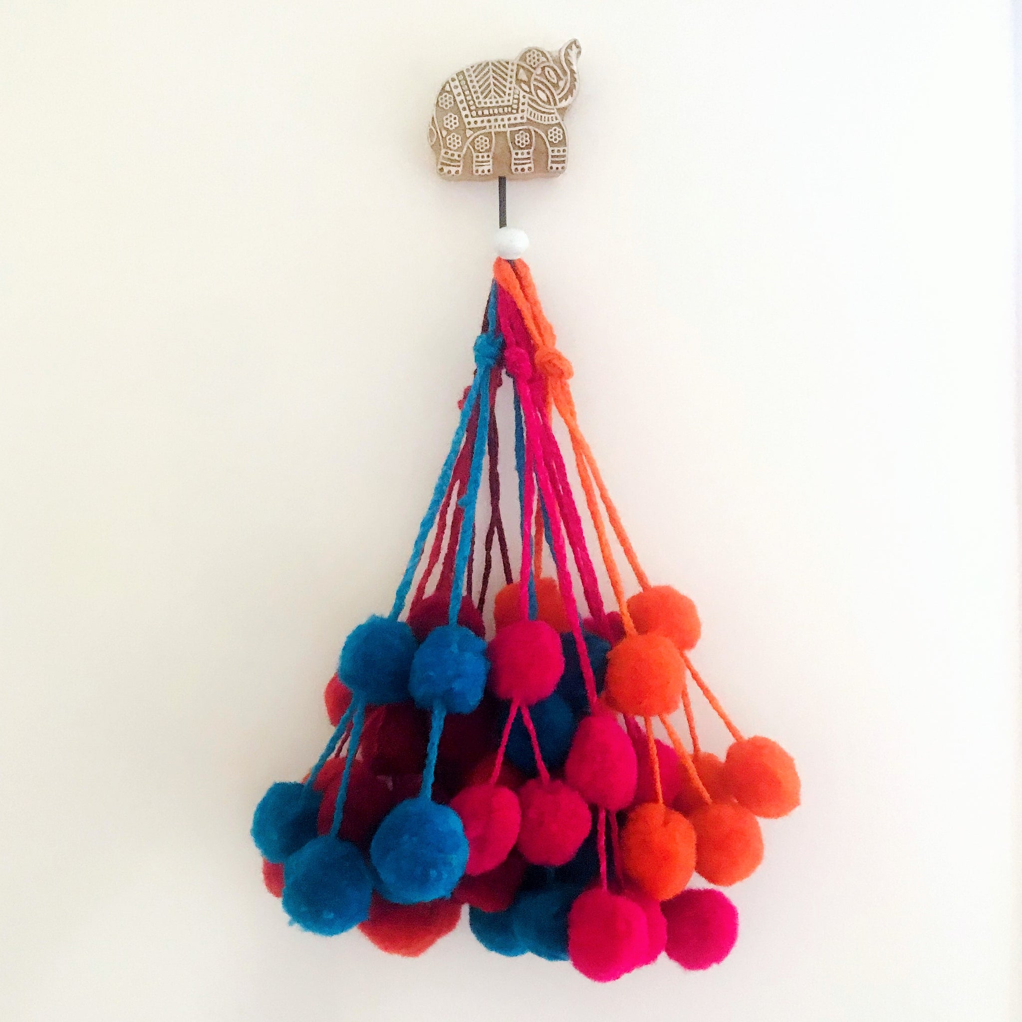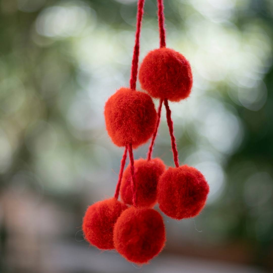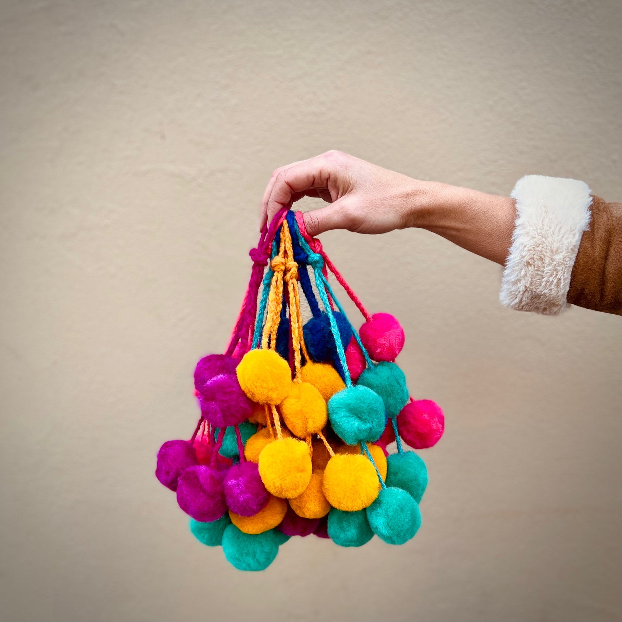 Tiras decorativas con tres pompones en cada extremo. Realizadas en pura lana teñida naturalmente por las artesanas que las elaboran. Ideales para decorar los picaportes o cajoneras de tu casa y/o sujetar cortinas.