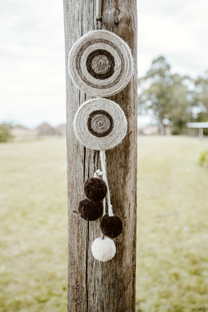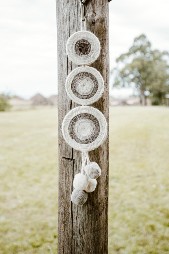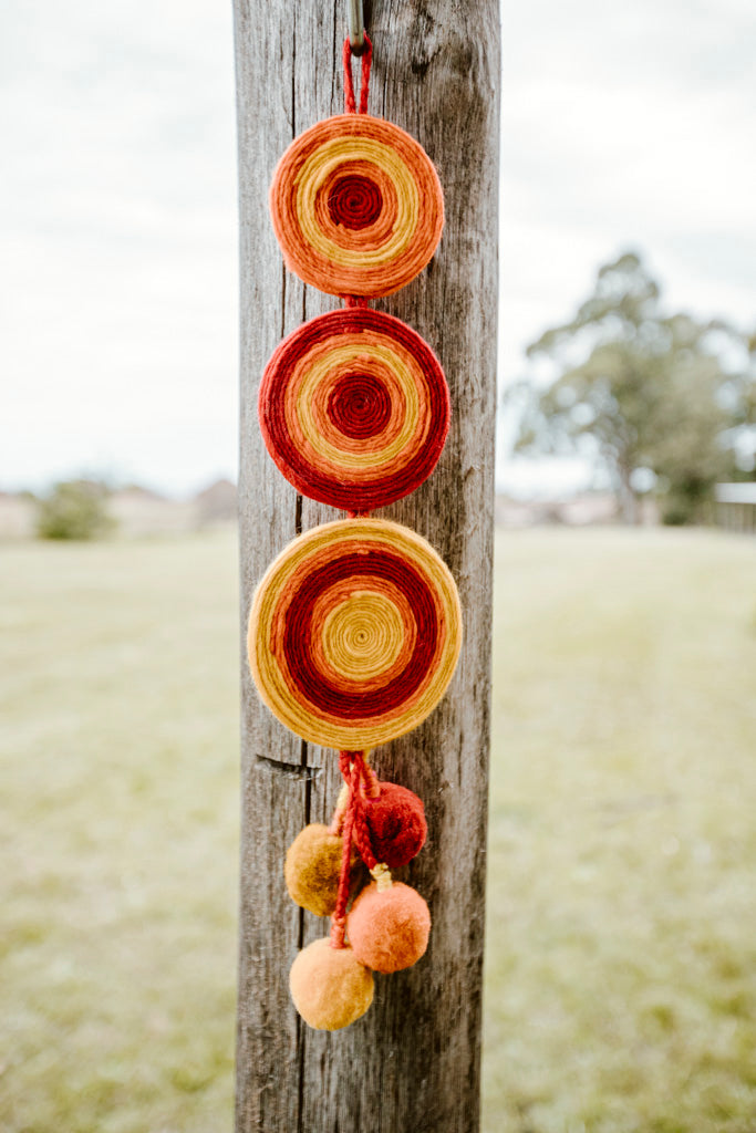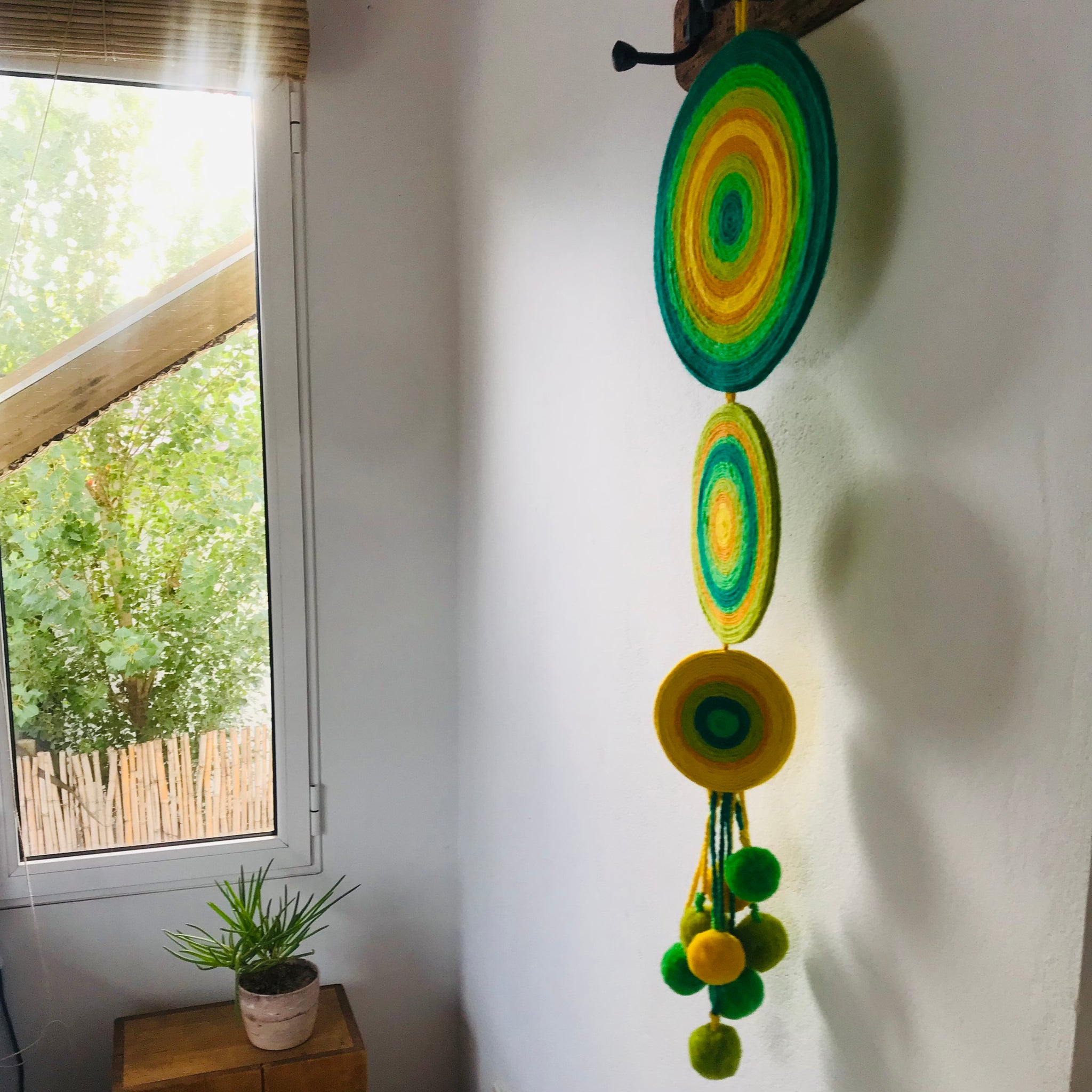 Atrapasueños realizados con discos de espirales de lana con detalles de tulmas abajo.