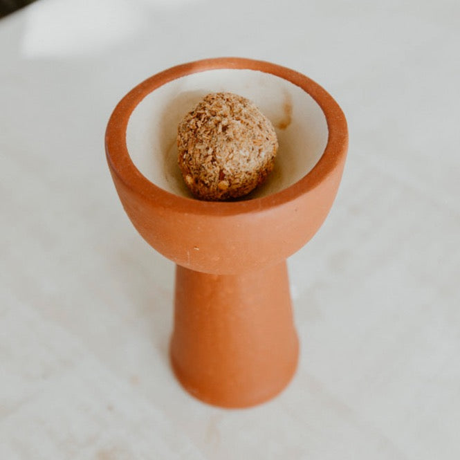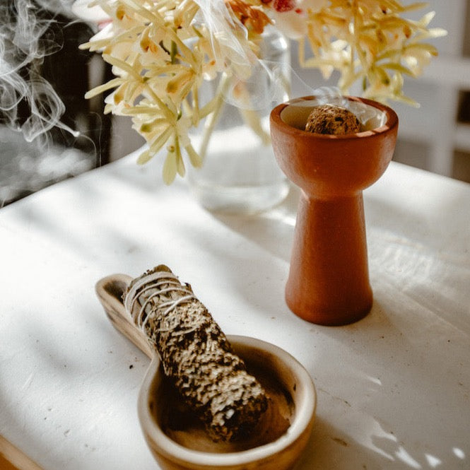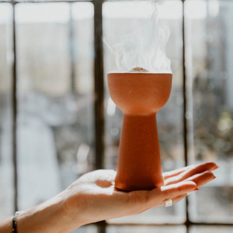 Coplera para realizar defumaciones. Elaborada en materiales especiales que pueden resistir las altas temperaturas que genera una defumación. Color terracota.